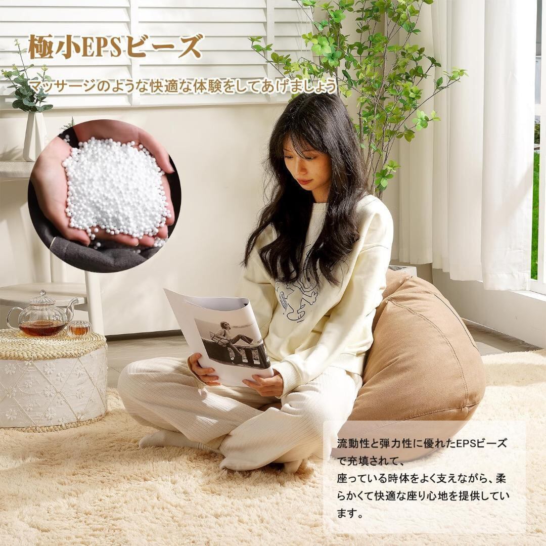 このビーズクッションはエコで健康的なEPSビーズで充填されています。硬すぎず緩すぎないという適切な柔軟性と良い流動性を追求するために、ビーズの量にこだわって充填されました。必要に応じてビーズクッション内の粒子の流れ方向を調整できます。座っている時体をよく支えながら、柔らかくて快適な座り心地を提供しています。